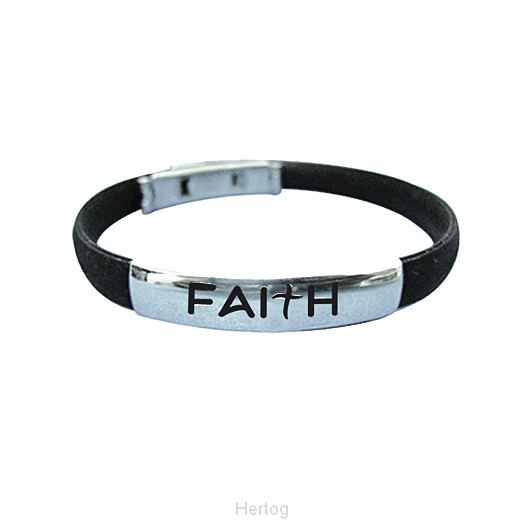 - Siliconen/zink/aluminium polsbandje met de tekst 'Faith'.