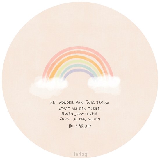 - Ronde wenskaart met envelop Formaat cirkel: 15 cm. Opdruk: Het wonder van Gods trouw staat als een teken boven jouw leven zodat je mag weten Hij is bij jou © Made by Alett Meer